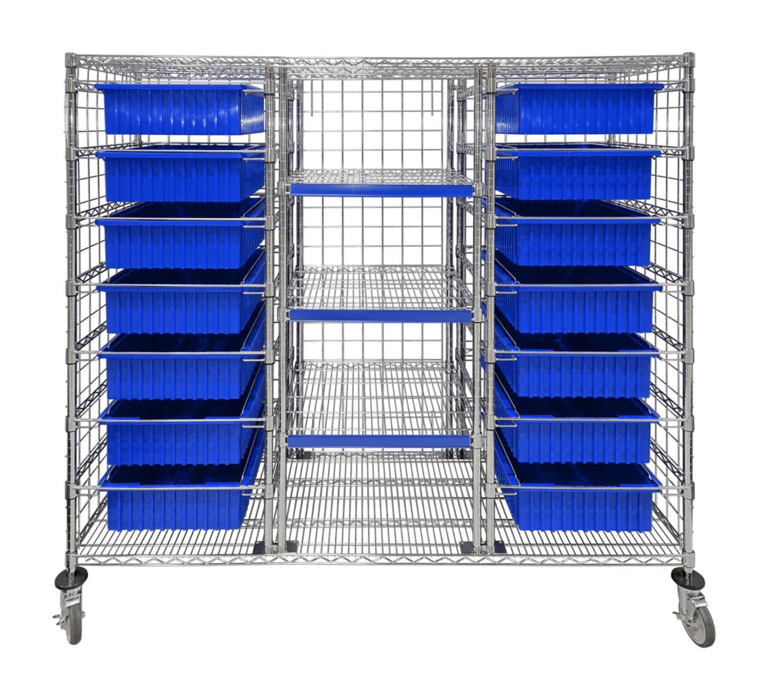 Combination Cart, 24″ D x 72″ W x 69″ H, with four 24″ Wire Shelves + 14 Drawers.